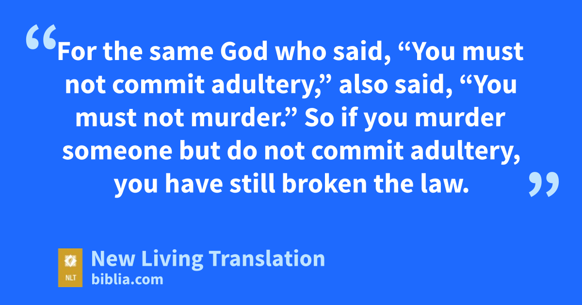 10 For the person who keeps all of the laws except one is as guilty as a person who has broken all of God’s laws. 11 For the same God who said, “You must not commit adultery,” also said, “You must not murder.”* So if you murder someone but do not commit adultery, you have still broken the law.