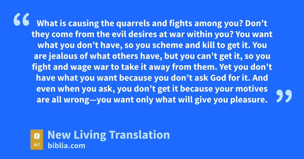 What is causing the quarrels and fights among you? Don’t they come from the evil desires at war within you? 2 You want what you don’t have, so you scheme and kill to get it. You are jealous of what others have, but you can’t get it, so you fight and wage war to take it away from them. Yet you don’t have what you want because you don’t ask God for it. 3 And even when you ask, you don’t get it because your motives are all wrong—you want only what will give you pleasure.