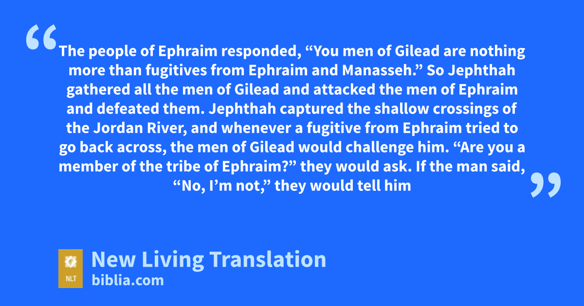 5 Jephthah captured the shallow crossings of the Jordan River, and whenever a fugitive from Ephraim tried to go back across, the men of Gilead would challenge him. “Are you a member of the tribe of Ephraim?” they would ask. If the man said, “No, I’m not,” 6 they would tell him to say “Shibboleth.” If he was from Ephraim, he would say “Sibboleth,” because people from Ephraim cannot pronounce the word correctly. Then they would take him and kill him at the shallow crossings of the Jordan. In all, 42,000 Ephraimites were killed at that time.