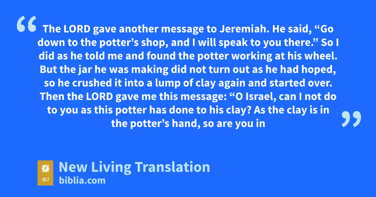 The Lord gave another message to Jeremiah. He said, 2 “Go down to the potter’s shop, and I will speak to you there.” 3 So I did as he told me and found the potter working at his wheel. 4 But the jar he was making did not turn out as he had hoped, so he crushed it into a lump of clay again and started over.