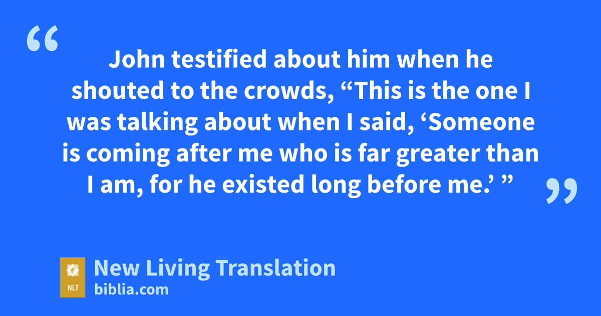 15 John testified about him when he shouted to the crowds, “This is the one I was talking about when I said, ‘Someone is coming after me who is far greater than I am, for he existed long before me.’ ”