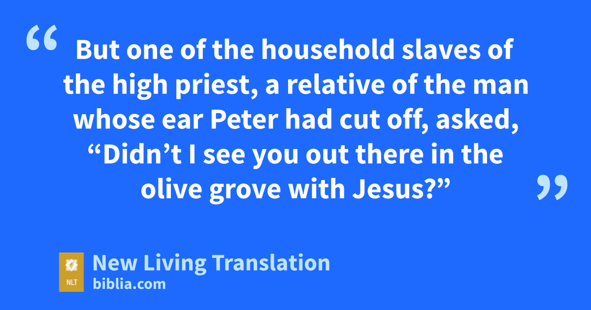 26 But one of the household slaves of the high priest, a relative of the man whose ear Peter had cut off, asked, “Didn’t I see you out there in the olive grove with Jesus?” 27 Again Peter denied it. And immediately a rooster crowed.