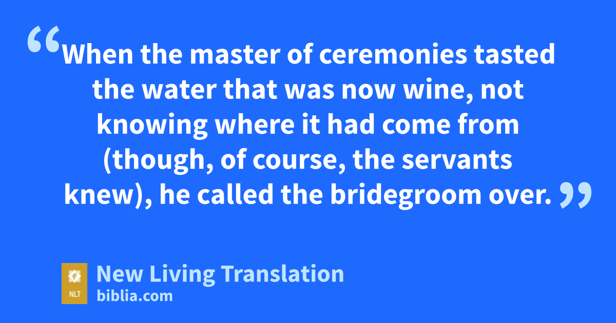 9 When the master of ceremonies tasted the water that was now wine, not knowing where it had come from (though, of course, the servants knew), he called the bridegroom over. 10 “A host always serves the best wine first,” he said. “Then, when everyone has had a lot to drink, he brings out the less expensive wine. But you have kept the best until now!”