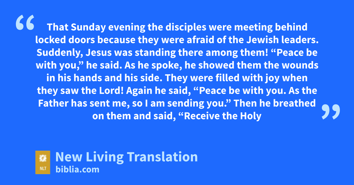 19 That Sunday evening* the disciples were meeting behind locked doors because they were afraid of the Jewish leaders. Suddenly, Jesus was standing there among them! “Peace be with you,” he said. 20 As he spoke, he showed them the wounds in his hands and his side. They were filled with joy when they saw the Lord! 21 Again he said, “Peace be with you. As the Father has sent me, so I am sending you.” 22 Then he breathed on them and said, “Receive the Holy Spirit. 23 If you forgive anyone’s sins, they are forgiven. If you do not forgive them, they are not forgiven.”