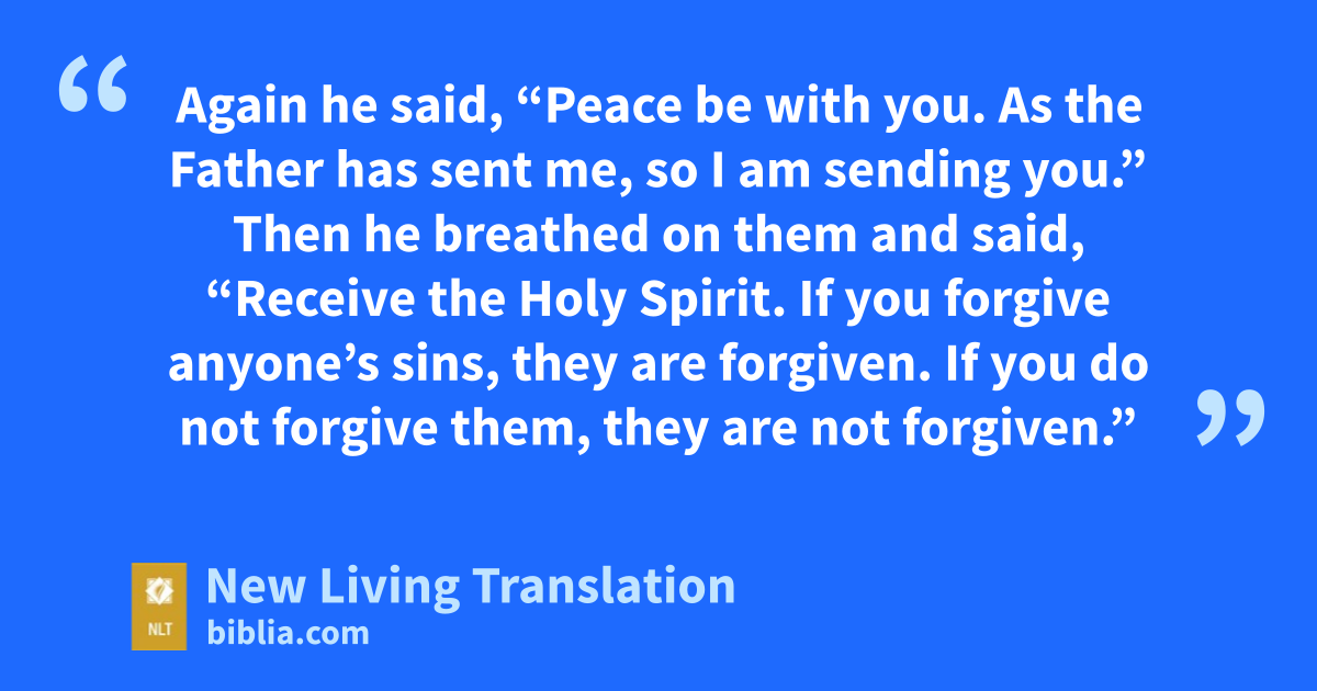 19 That Sunday evening* the disciples were meeting behind locked doors because they were afraid of the Jewish leaders. Suddenly, Jesus was standing there among them! “Peace be with you,” he said. 20 As he spoke, he showed them the wounds in his hands and his side. They were filled with joy when they saw the Lord! 21 Again he said, “Peace be with you. As the Father has sent me, so I am sending you.” 22 Then he breathed on them and said, “Receive the Holy Spirit. 23 If you forgive anyone’s sins, they are forgiven. If you do not forgive them, they are not forgiven.”