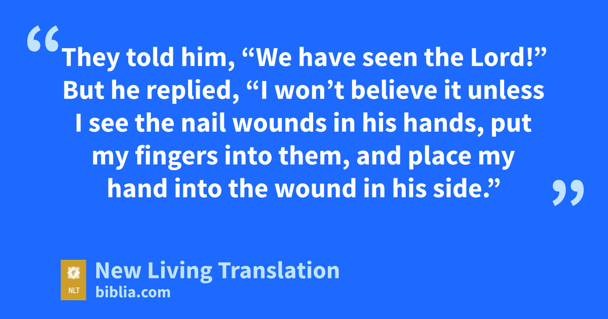 But he replied, “I won’t believe it unless I see the nail wounds in his hands, put my fingers into them, and place my hand into the wound in his side.”