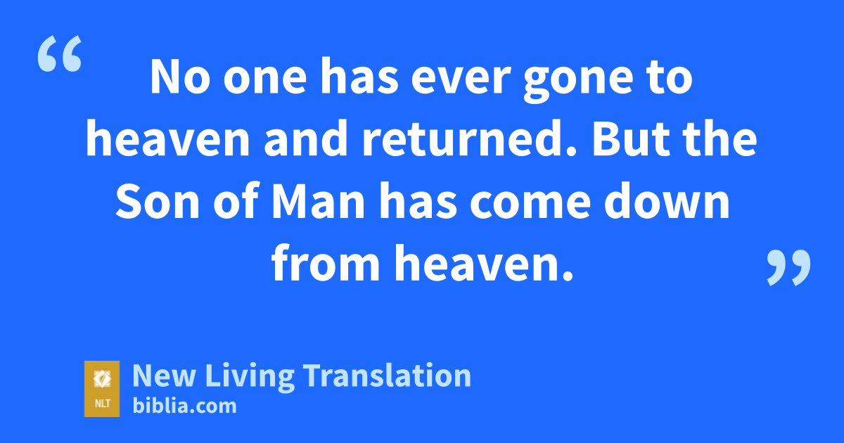 10 Jesus replied, “You are a respected Jewish teacher, and yet you don’t understand these things? 11 I assure you, we tell you what we know and have seen, and yet you won’t believe our testimony. 12 But if you don’t believe me when I tell you about earthly things, how can you possibly believe if I tell you about heavenly things? 13 No one has ever gone to heaven and returned. But the Son of Man* has come down from heaven. 14 And as Moses lifted up the bronze snake on a pole in the wilderness, so the Son of Man must be lifted up, 15 so that everyone who believes in him will have eternal life.*