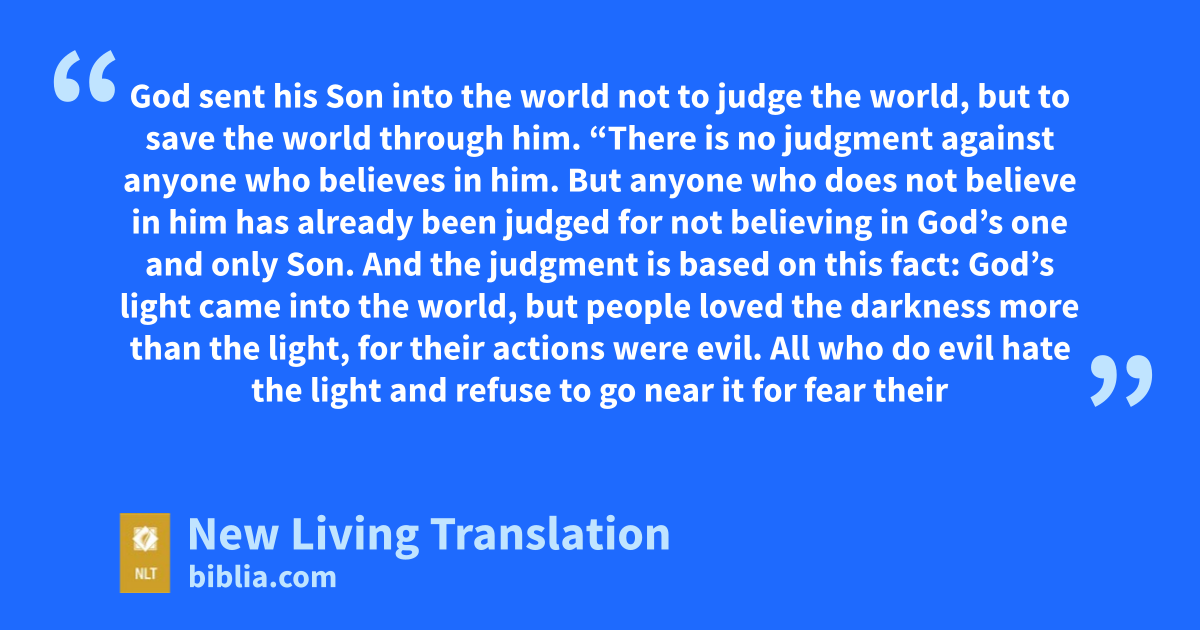 18 “There is no judgment against anyone who believes in him. But anyone who does not believe in him has already been judged for not believing in God’s one and only Son. 19 And the judgment is based on this fact: God’s light came into the world, but people loved the darkness more than the light, for their actions were evil. 20 All who do evil hate the light and refuse to go near it for fear their sins will be exposed. 21 But those who do what is right come to the light so others can see that they are doing what God wants.* ”