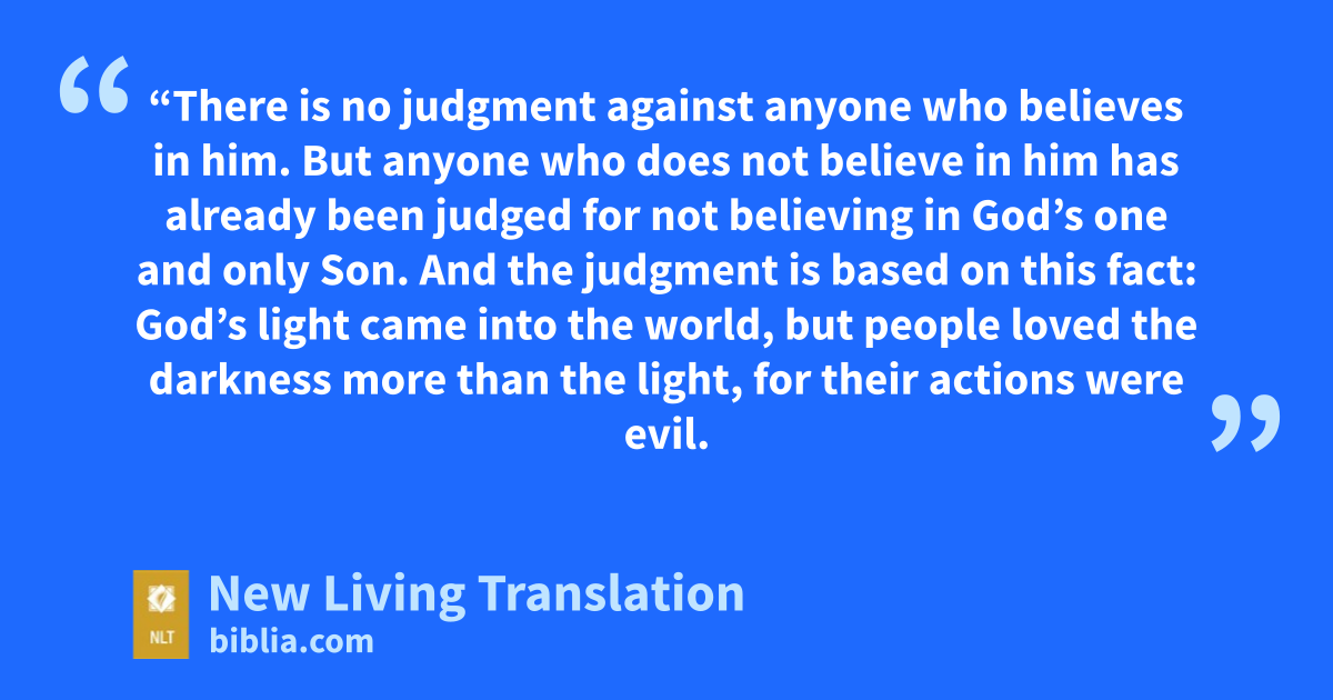 18 “There is no judgment against anyone who believes in him. But anyone who does not believe in him has already been judged for not believing in God’s one and only Son. 19 And the judgment is based on this fact: God’s light came into the world, but people loved the darkness more than the light, for their actions were evil. 20 All who do evil hate the light and refuse to go near it for fear their sins will be exposed. 21 But those who do what is right come to the light so others can see that they are doing what God wants.* ”