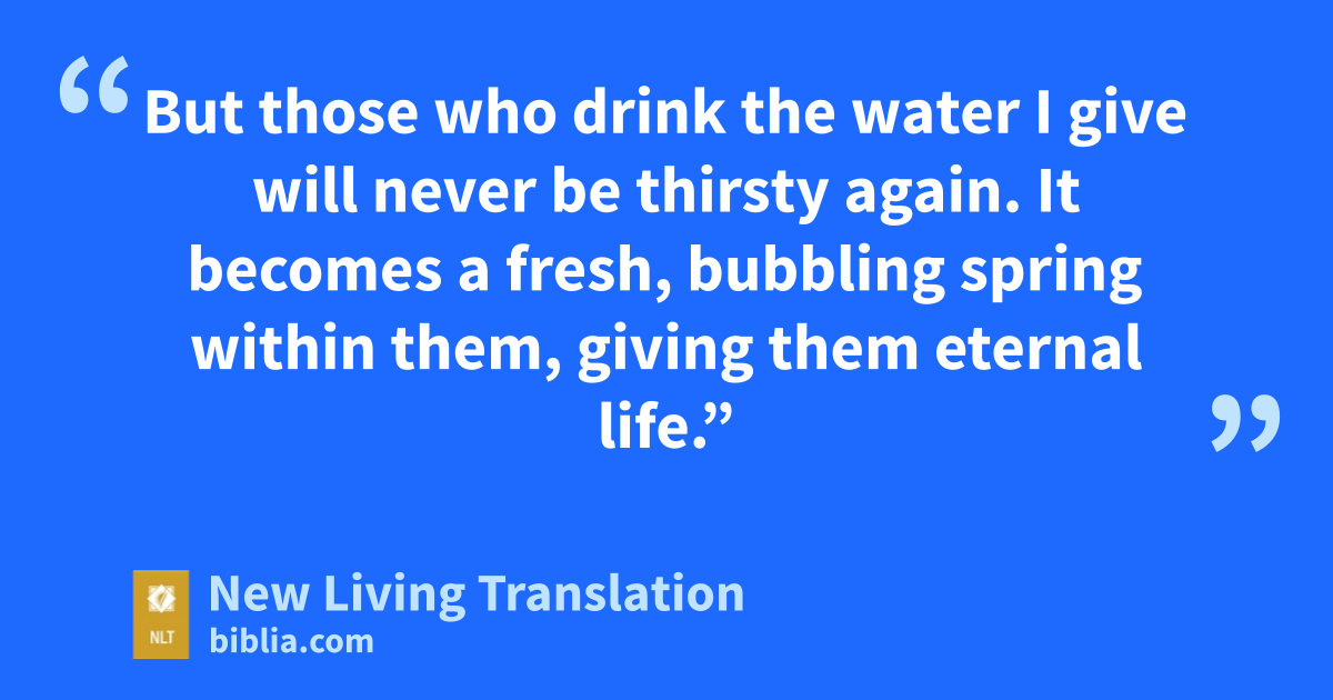 13 Jesus replied, “Anyone who drinks this water will soon become thirsty again. 14 But those who drink the water I give will never be thirsty again. It becomes a fresh, bubbling spring within them, giving them eternal life.”