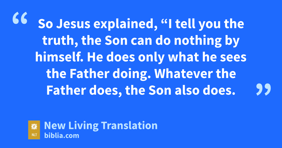 19 So Jesus explained, “I tell you the truth, the Son can do nothing by himself. He does only what he sees the Father doing. Whatever the Father does, the Son also does. 20 For the Father loves the Son and shows him everything he is doing. In fact, the Father will show him how to do even greater works than healing this man. Then you will truly be astonished. 21 For just as the Father gives life to those he raises from the dead, so the Son gives life to anyone he wants. 22 In addition, the Father judges no one. Instead, he has given the Son absolute authority to judge, 23 so that everyone will honor the Son, just as they honor the Father. Anyone who does not honor the Son is certainly not honoring the Father who sent him.