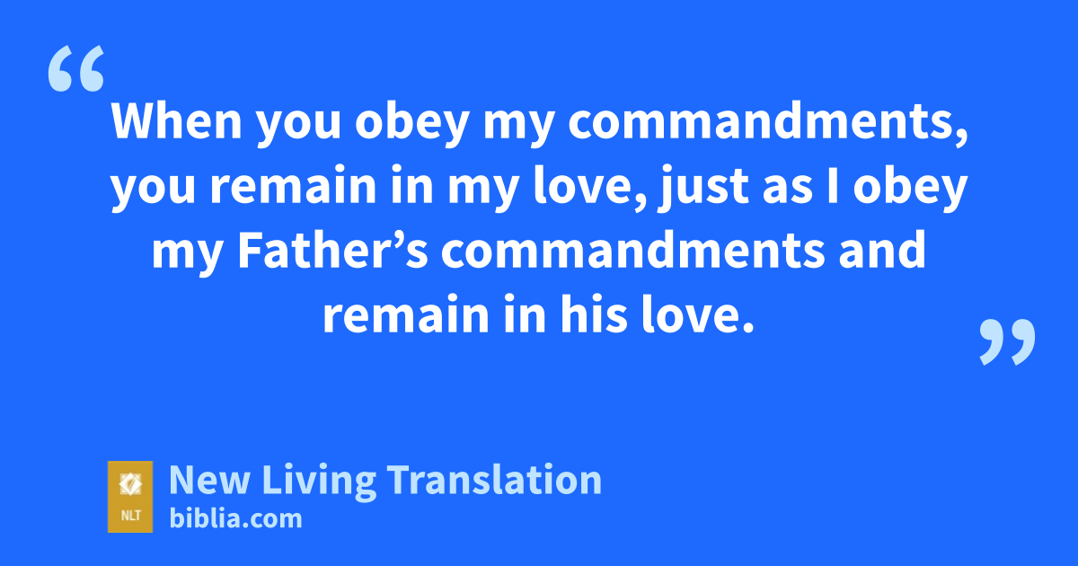 9 “I have loved you even as the Father has loved me. Remain in my love. 10 When you obey my commandments, you remain in my love, just as I obey my Father’s commandments and remain in his love. 11 I have told you these things so that you will be filled with my joy. Yes, your joy will overflow! 12 This is my commandment: Love each other in the same way I have loved you. 13 There is no greater love than to lay down one’s life for one’s friends. 14 You are my friends if you do what I command. 15 I no longer call you slaves, because a master doesn’t confide in his slaves. Now you are my friends, since I have told you everything the Father told me. 16 You didn’t choose me. I chose you. I appointed you to go and produce lasting fruit, so that the Father will give you whatever you ask for, using my name. 17 This is my command: Love each other.