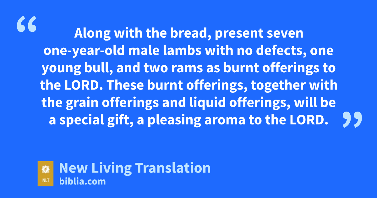 9 Then the Lord said to Moses, 10 “Give the following instructions to the people of Israel. When you enter the land I am giving you and you harvest its first crops, bring the priest a bundle of grain from the first cutting of your grain harvest. 11 On the day after the Sabbath, the priest will lift it up before the Lord so it may be accepted on your behalf. 12 On that same day you must sacrifice a one-year-old male lamb with no defects as a burnt offering to the Lord. 13 With it you must present a grain offering consisting of four quarts* of choice flour moistened with olive oil. It will be a special gift, a pleasing aroma to the Lord. You must also offer one quart* of wine as a liquid offering. 14 Do not eat any bread or roasted grain or fresh kernels on that day until you bring this offering to your God. This is a permanent law for you, and it must be observed from generation to generation wherever you live.