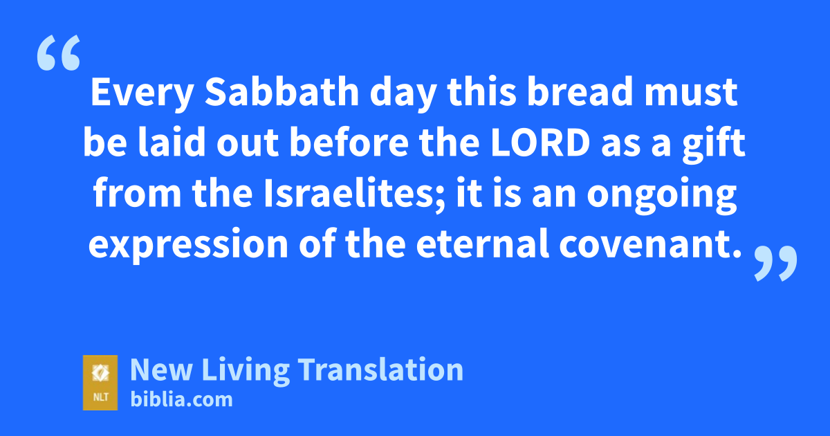 5 “You must bake twelve flat loaves of bread from choice flour, using four quarts* of flour for each loaf. 6 Place the bread before the Lord on the pure gold table, and arrange the loaves in two stacks, with six loaves in each stack. 7 Put some pure frankincense near each stack to serve as a representative offering, a special gift presented to the Lord. 8 Every Sabbath day this bread must be laid out before the Lord as a gift from the Israelites; it is an ongoing expression of the eternal covenant. 9 The loaves of bread will belong to Aaron and his descendants, who must eat them in a sacred place, for they are most holy. It is the permanent right of the priests to claim this portion of the special gifts presented to the Lord.”
