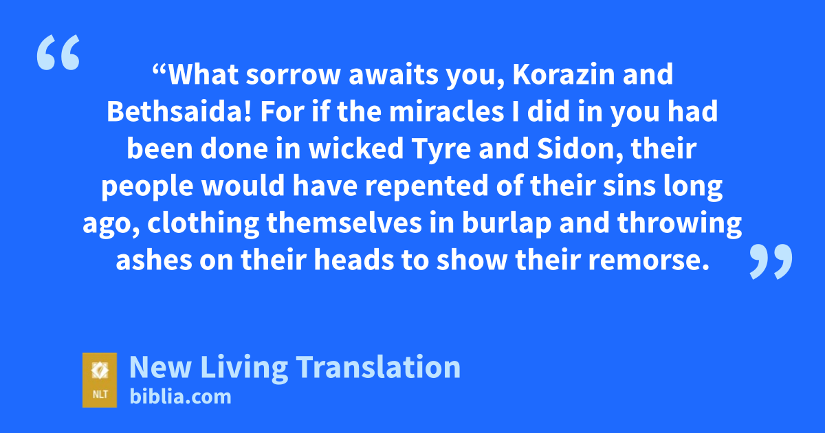 13 “What sorrow awaits you, Korazin and Bethsaida! For if the miracles I did in you had been done in wicked Tyre and Sidon, their people would have repented of their sins long ago, clothing themselves in burlap and throwing ashes on their heads to show their remorse. 14 Yes, Tyre and Sidon will be better off on judgment day than you. 15 And you people of Capernaum, will you be honored in heaven? No, you will go down to the place of the dead.* ”