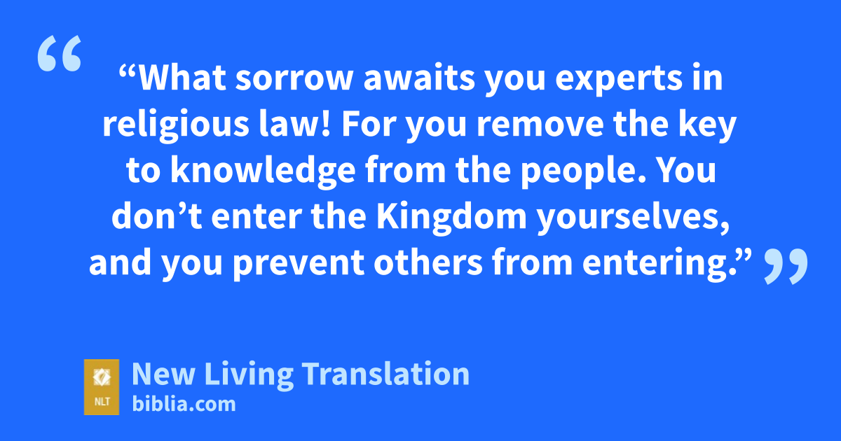 52 “What sorrow awaits you experts in religious law! For you remove the key to knowledge from the people. You don’t enter the Kingdom yourselves, and you prevent others from entering.”