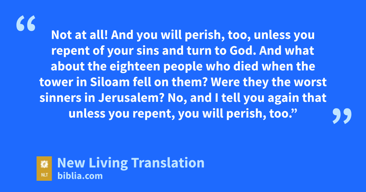About this time Jesus was informed that Pilate had murdered some people from Galilee as they were offering sacrifices at the Temple. 2 “Do you think those Galileans were worse sinners than all the other people from Galilee?” Jesus asked. “Is that why they suffered? 3 Not at all! And you will perish, too, unless you repent of your sins and turn to God. 4 And what about the eighteen people who died when the tower in Siloam fell on them? Were they the worst sinners in Jerusalem? 5 No, and I tell you again that unless you repent, you will perish, too.”