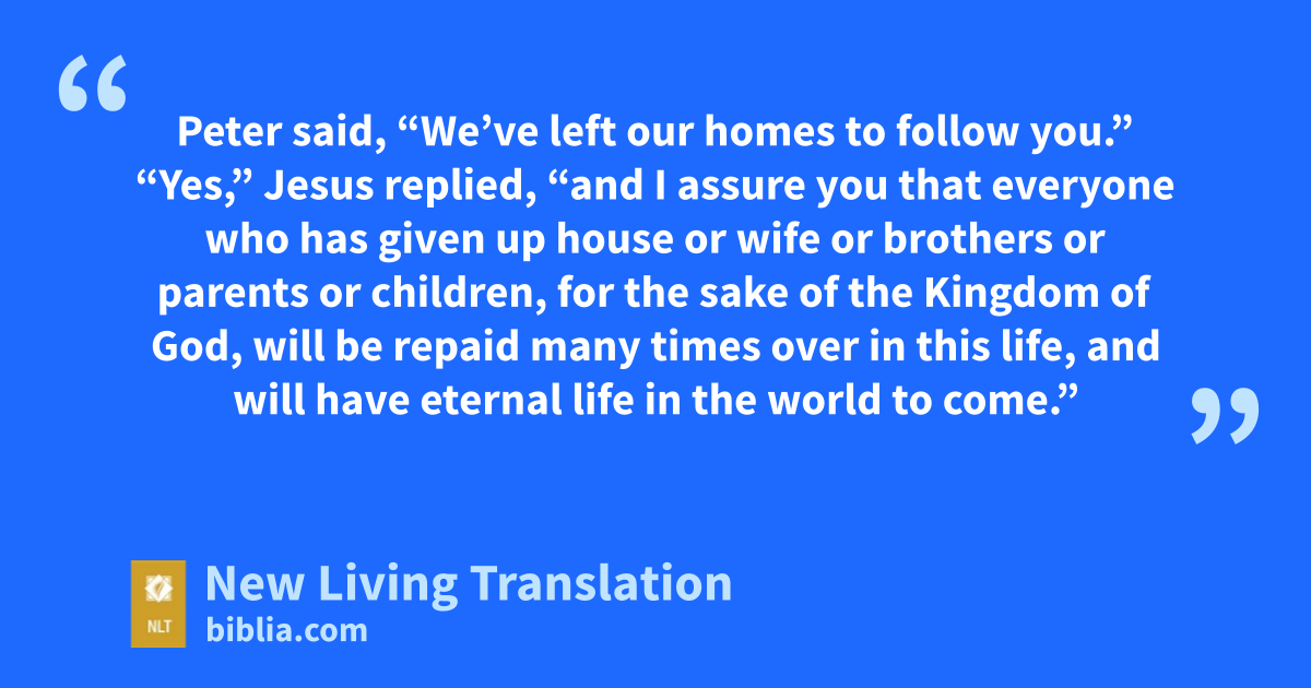 29 “Yes,” Jesus replied, “and I assure you that everyone who has given up house or wife or brothers or parents or children, for the sake of the Kingdom of God, 30 will be repaid many times over in this life, and will have eternal life in the world to come.”