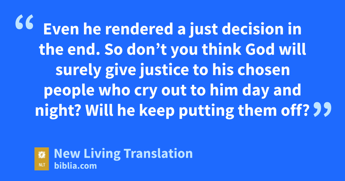 6 Then the Lord said, “Learn a lesson from this unjust judge. 7 Even he rendered a just decision in the end. So don’t you think God will surely give justice to his chosen people who cry out to him day and night? Will he keep putting them off? 8 I tell you, he will grant justice to them quickly! But when the Son of Man* returns, how many will he find on the earth who have faith?”
