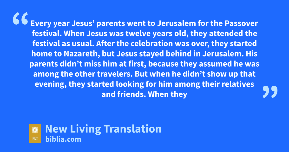41 Every year Jesus’ parents went to Jerusalem for the Passover festival. 42 When Jesus was twelve years old, they attended the festival as usual. 43 After the celebration was over, they started home to Nazareth, but Jesus stayed behind in Jerusalem. His parents didn’t miss him at first, 44 because they assumed he was among the other travelers. But when he didn’t show up that evening, they started looking for him among their relatives and friends.