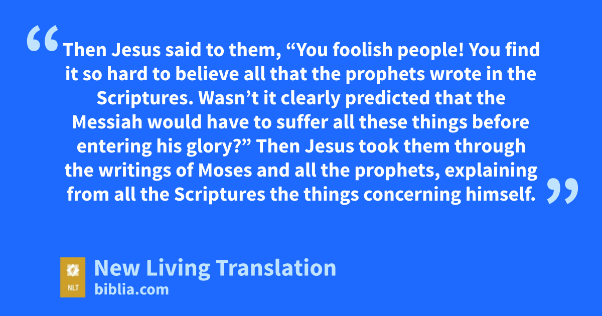 25 Then Jesus said to them, “You foolish people! You find it so hard to believe all that the prophets wrote in the Scriptures. 26 Wasn’t it clearly predicted that the Messiah would have to suffer all these things before entering his glory?” 27 Then Jesus took them through the writings of Moses and all the prophets, explaining from all the Scriptures the things concerning himself.