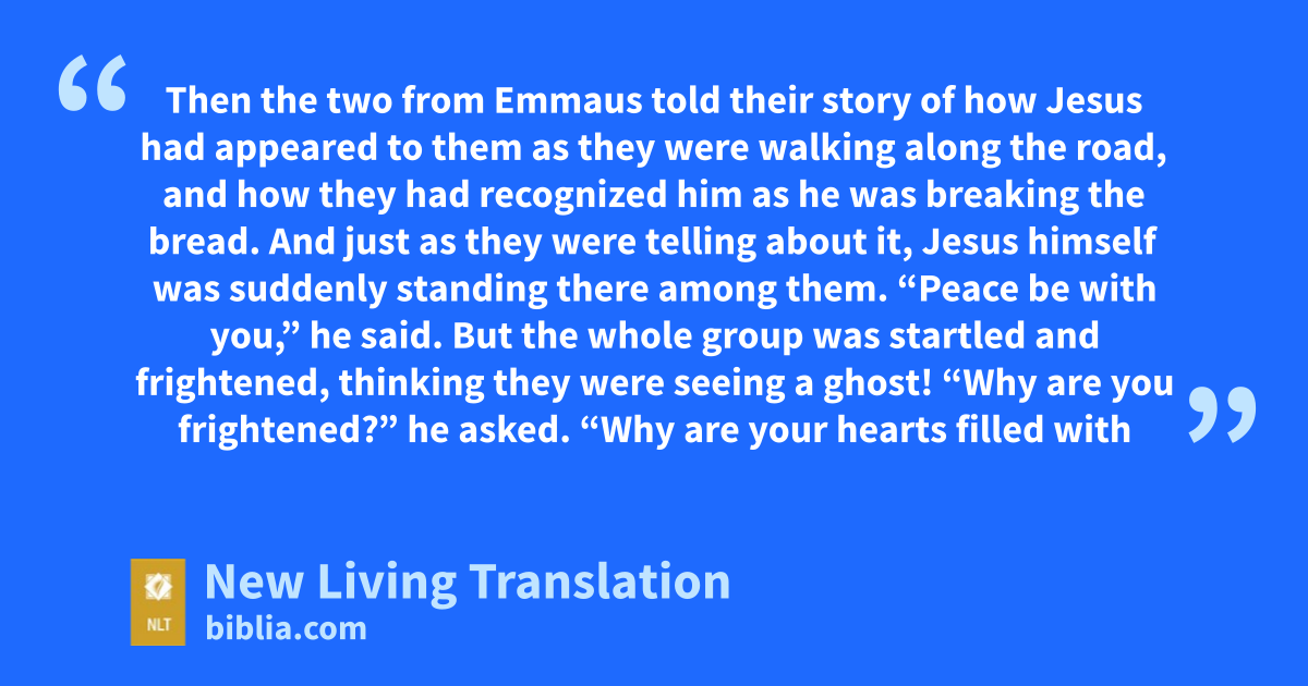 35 Then the two from Emmaus told their story of how Jesus had appeared to them as they were walking along the road, and how they had recognized him as he was breaking the bread. 36 And just as they were telling about it, Jesus himself was suddenly standing there among them. “Peace be with you,” he said. 37 But the whole group was startled and frightened, thinking they were seeing a ghost!