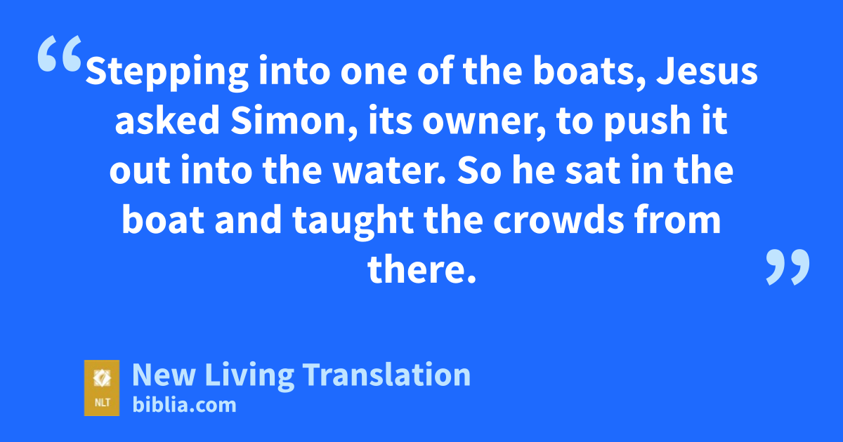 One day as Jesus was preaching on the shore of the Sea of Galilee,* great crowds pressed in on him to listen to the word of God. 2 He noticed two empty boats at the water’s edge, for the fishermen had left them and were washing their nets. 3 Stepping into one of the boats, Jesus asked Simon,* its owner, to push it out into the water. So he sat in the boat and taught the crowds from there.