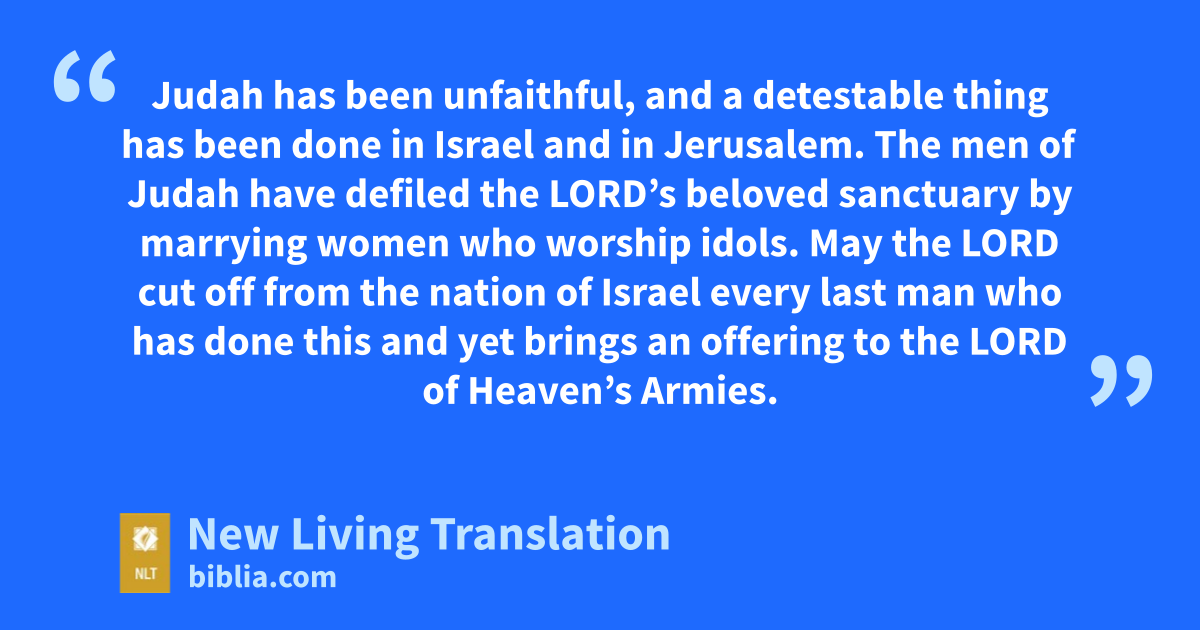 11 Judah has been unfaithful, and a detestable thing has been done in Israel and in Jerusalem. The men of Judah have defiled the Lord’s beloved sanctuary by marrying women who worship idols. 12 May the Lord cut off from the nation of Israel* every last man who has done this and yet brings an offering to the Lord of Heaven’s Armies.