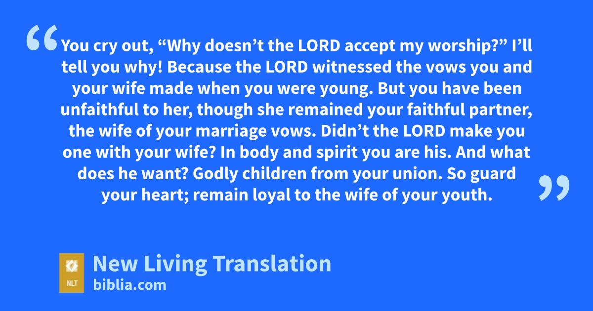 13 Here is another thing you do. You cover the Lord’s altar with tears, weeping and groaning because he pays no attention to your offerings and doesn’t accept them with pleasure. 14 You cry out, “Why doesn’t the Lord accept my worship?” I’ll tell you why! Because the Lord witnessed the vows you and your wife made when you were young. But you have been unfaithful to her, though she remained your faithful partner, the wife of your marriage vows.