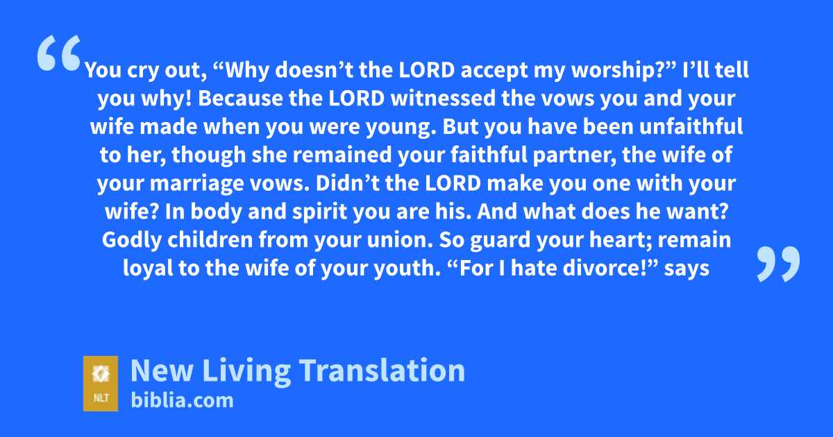 15 Didn’t the Lord make you one with your wife? In body and spirit you are his.* And what does he want? Godly children from your union. So guard your heart; remain loyal to the wife of your youth. 16 “For I hate divorce!”* says the Lord, the God of Israel. “To divorce your wife is to overwhelm her with cruelty,* ” says the Lord of Heaven’s Armies. “So guard your heart; do not be unfaithful to your wife.”