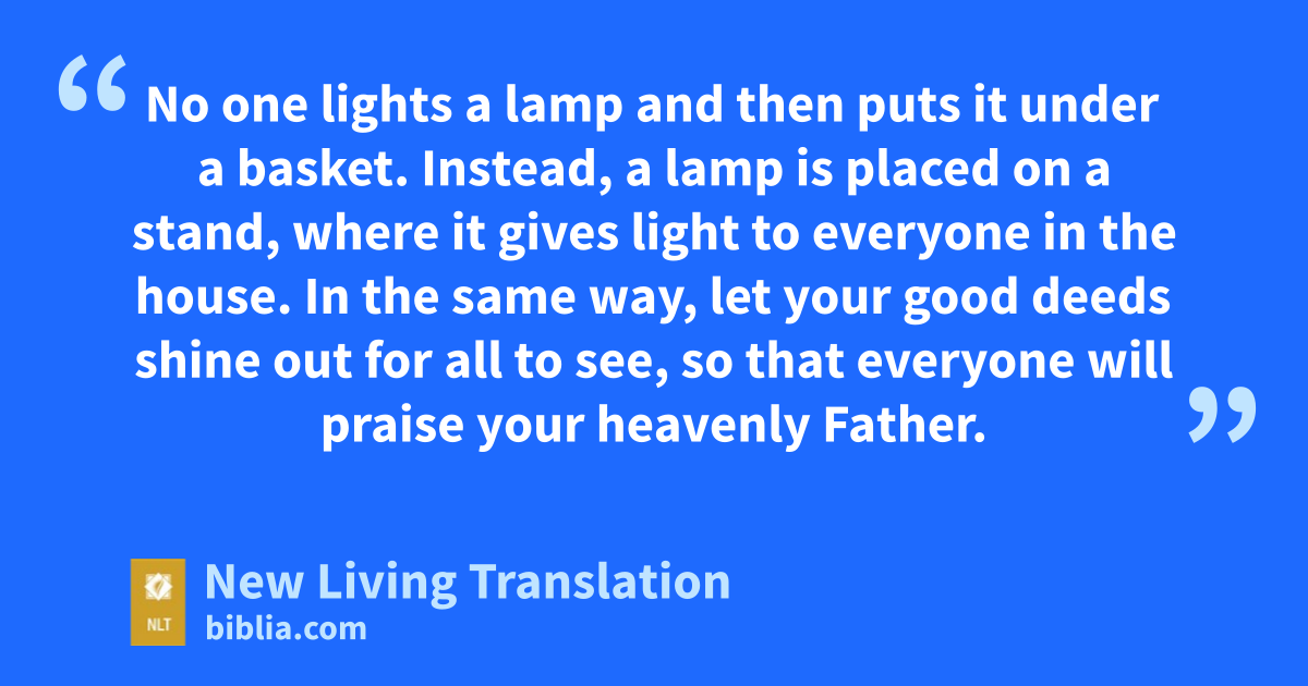 14 “You are the light of the world—like a city on a hilltop that cannot be hidden. 15 No one lights a lamp and then puts it under a basket. Instead, a lamp is placed on a stand, where it gives light to everyone in the house. 16 In the same way, let your good deeds shine out for all to see, so that everyone will praise your heavenly Father.