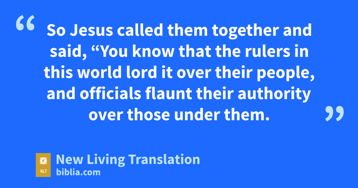 41 When the ten other disciples heard what James and John had asked, they were indignant. 42 So Jesus called them together and said, “You know that the rulers in this world lord it over their people, and officials flaunt their authority over those under them. 43 But among you it will be different. Whoever wants to be a leader among you must be your servant, 44 and whoever wants to be first among you must be the slave of everyone else. 45 For even the Son of Man came not to be served but to serve others and to give his life as a ransom for many.”