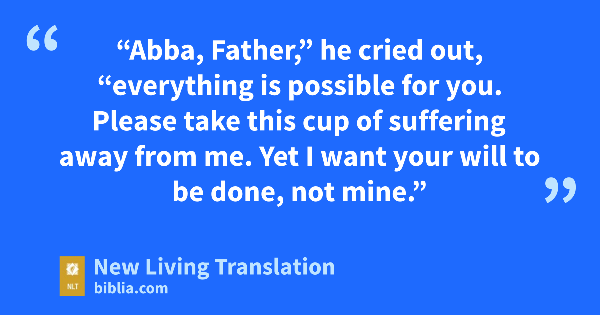 35 He went on a little farther and fell to the ground. He prayed that, if it were possible, the awful hour awaiting him might pass him by. 36 “Abba, Father,”* he cried out, “everything is possible for you. Please take this cup of suffering away from me. Yet I want your will to be done, not mine.”