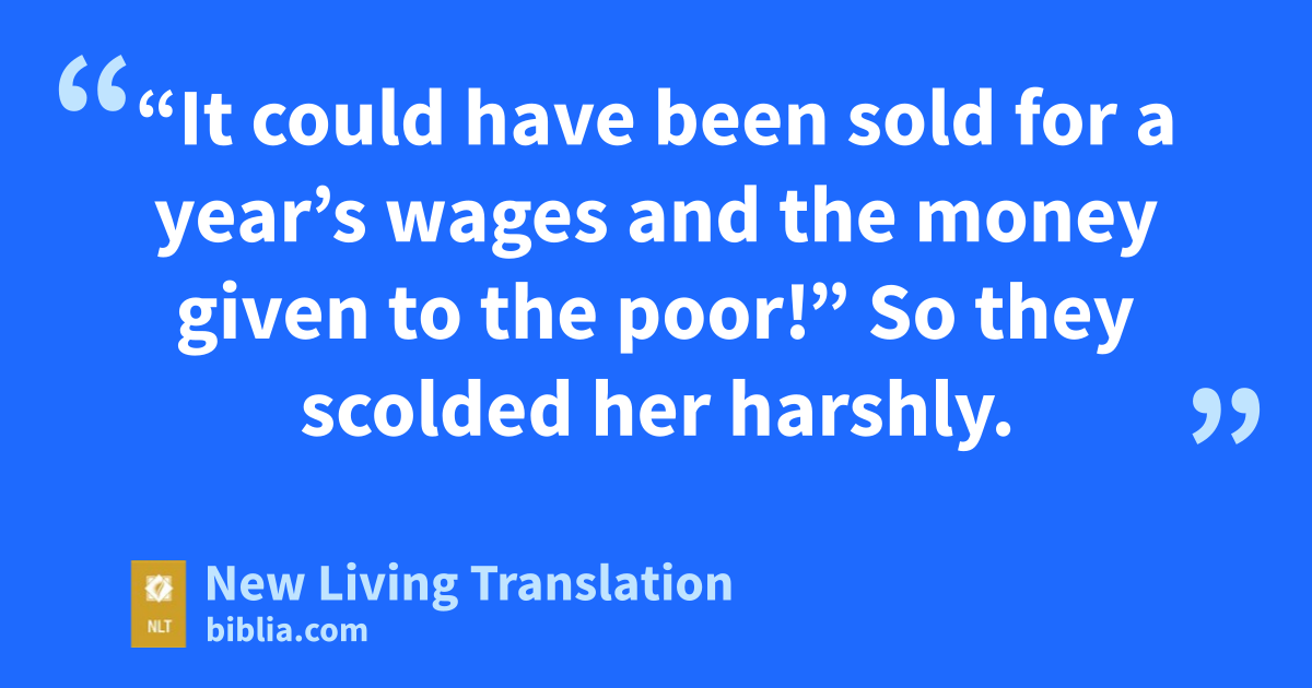 4 Some of those at the table were indignant. “Why waste such expensive perfume?” they asked. 5 “It could have been sold for a year’s wages* and the money given to the poor!” So they scolded her harshly.