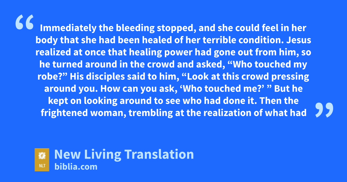 24 Jesus went with him, and all the people followed, crowding around him. 25 A woman in the crowd had suffered for twelve years with constant bleeding. 26 She had suffered a great deal from many doctors, and over the years she had spent everything she had to pay them, but she had gotten no better. In fact, she had gotten worse. 27 She had heard about Jesus, so she came up behind him through the crowd and touched his robe. 28 For she thought to herself, “If I can just touch his robe, I will be healed.” 29 Immediately the bleeding stopped, and she could feel in her body that she had been healed of her terrible condition.
