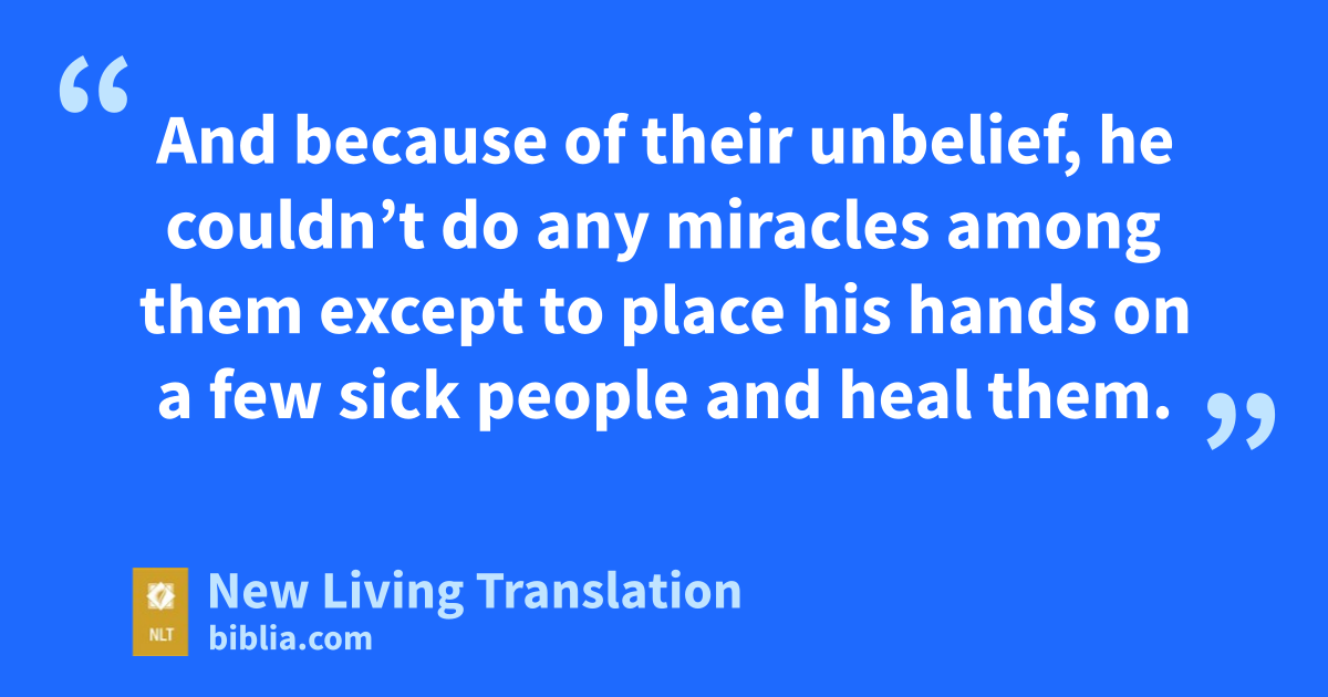 4 Then Jesus told them, “A prophet is honored everywhere except in his own hometown and among his relatives and his own family.” 5 And because of their unbelief, he couldn’t do any miracles among them except to place his hands on a few sick people and heal them. 6 And he was amazed at their unbelief.
