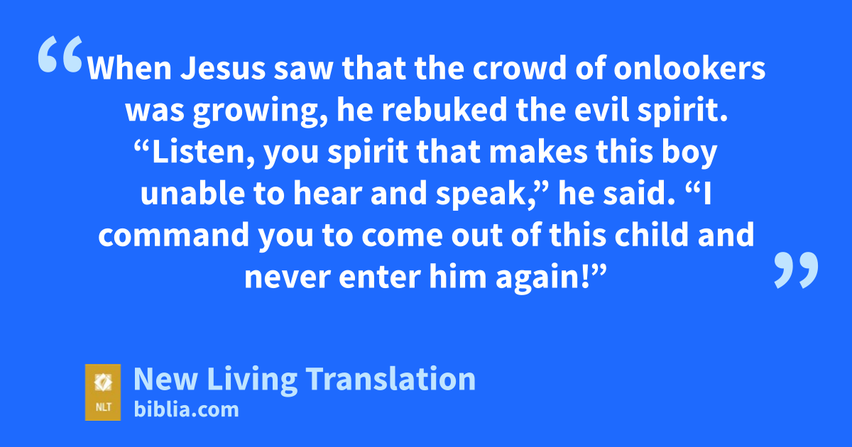 25 When Jesus saw that the crowd of onlookers was growing, he rebuked the evil* spirit. “Listen, you spirit that makes this boy unable to hear and speak,” he said. “I command you to come out of this child and never enter him again!”