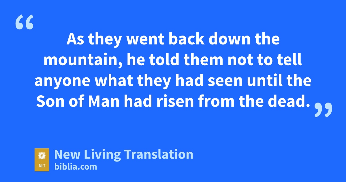 9 As they went back down the mountain, he told them not to tell anyone what they had seen until the Son of Man* had risen from the dead. 10 So they kept it to themselves, but they often asked each other what he meant by “rising from the dead.”