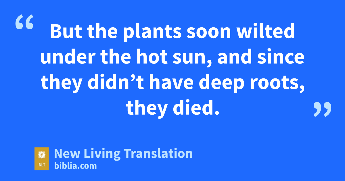 “Listen! A farmer went out to plant some seeds. 4 As he scattered them across his field, some seeds fell on a footpath, and the birds came and ate them. 5 Other seeds fell on shallow soil with underlying rock. The seeds sprouted quickly because the soil was shallow. 6 But the plants soon wilted under the hot sun, and since they didn’t have deep roots, they died. 7 Other seeds fell among thorns that grew up and choked out the tender plants. 8 Still other seeds fell on fertile soil, and they produced a crop that was thirty, sixty, and even a hundred times as much as had been planted! 9 Anyone with ears to hear should listen and understand.”
