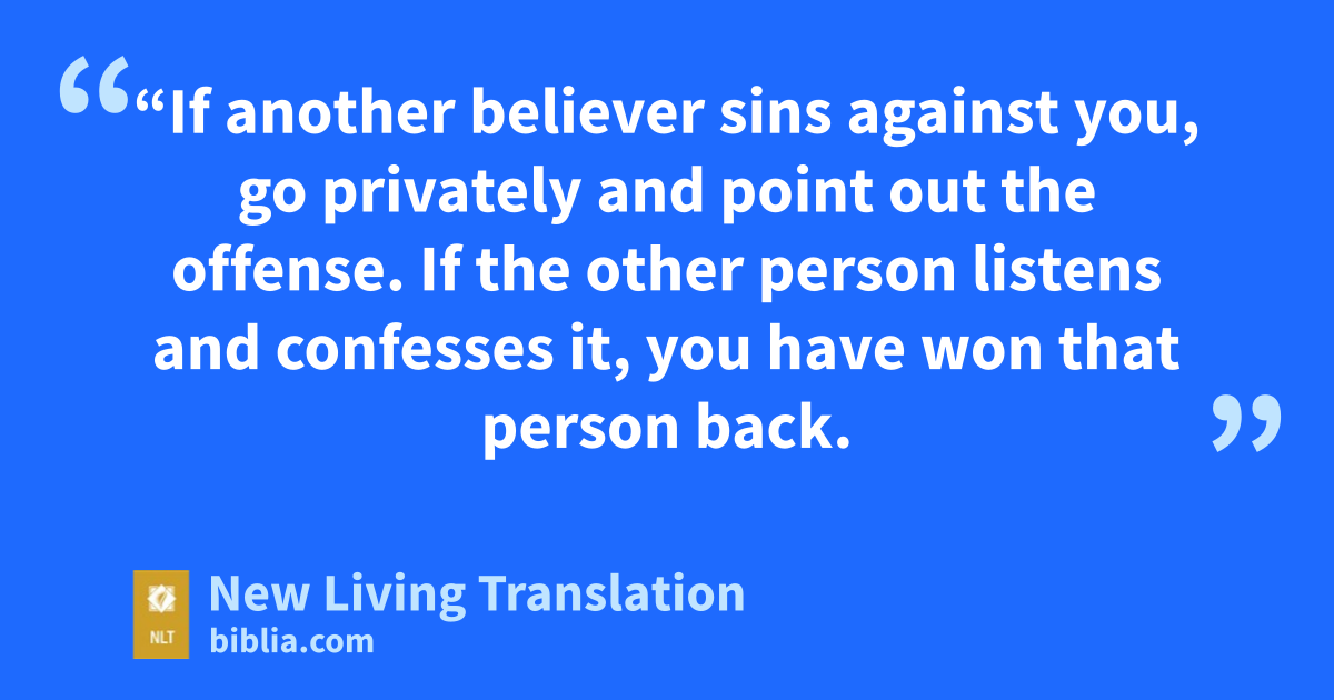 15 “If another believer* sins against you,* go privately and point out the offense. If the other person listens and confesses it, you have won that person back. 16 But if you are unsuccessful, take one or two others with you and go back again, so that everything you say may be confirmed by two or three witnesses. 17 If the person still refuses to listen, take your case to the church. Then if he or she won’t accept the church’s decision, treat that person as a pagan or a corrupt tax collector.