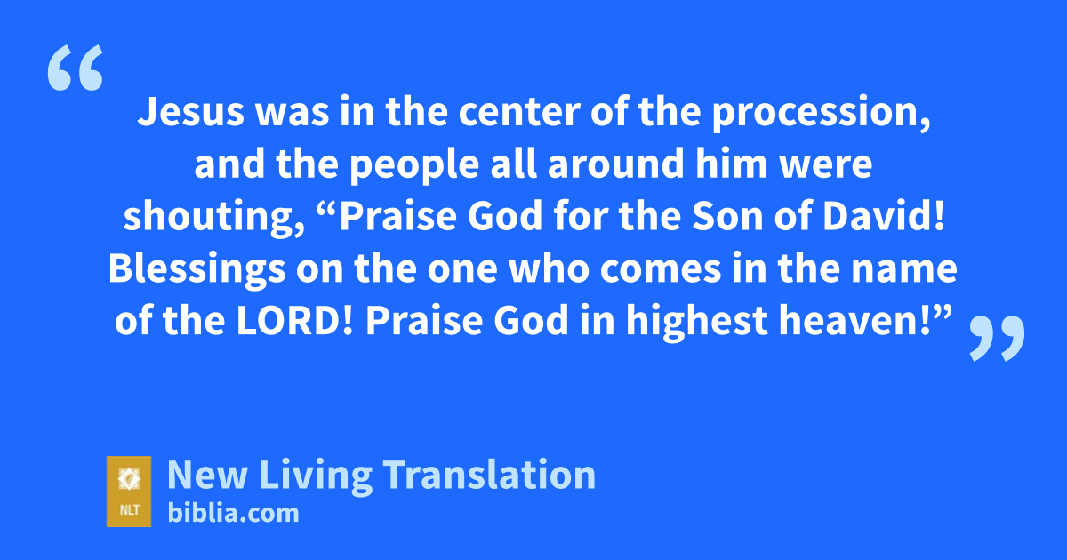 8 Most of the crowd spread their garments on the road ahead of him, and others cut branches from the trees and spread them on the road. 9 Jesus was in the center of the procession, and the people all around him were shouting,