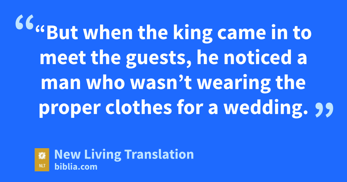 11 “But when the king came in to meet the guests, he noticed a man who wasn’t wearing the proper clothes for a wedding. 12 ‘Friend,’ he asked, ‘how is it that you are here without wedding clothes?’ But the man had no reply. 13 Then the king said to his aides, ‘Bind his hands and feet and throw him into the outer darkness, where there will be weeping and gnashing of teeth.’
