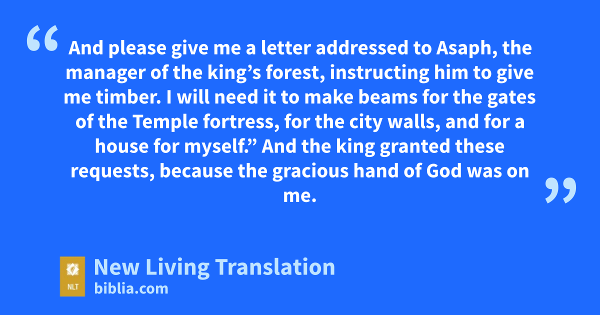 7 I also said to the king, “If it please the king, let me have letters addressed to the governors of the province west of the Euphrates River,* instructing them to let me travel safely through their territories on my way to Judah. 8 And please give me a letter addressed to Asaph, the manager of the king’s forest, instructing him to give me timber. I will need it to make beams for the gates of the Temple fortress, for the city walls, and for a house for myself.” And the king granted these requests, because the gracious hand of God was on me.