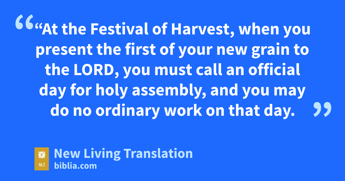 26 “At the Festival of Harvest,* when you present the first of your new grain to the Lord, you must call an official day for holy assembly, and you may do no ordinary work on that day. 27 Present a special burnt offering on that day as a pleasing aroma to the Lord. It will consist of two young bulls, one ram, and seven one-year-old male lambs. 28 These will be accompanied by grain offerings of choice flour moistened with olive oil—six quarts with each bull, four quarts with the ram, 29 and two quarts with each of the seven lambs. 30 Also, offer one male goat to purify yourselves and make yourselves right with the Lord. 31 Prepare these special burnt offerings, along with their liquid offerings, in addition to the regular burnt offering and its accompanying grain offering. Be sure that all the animals you sacrifice have no defects.