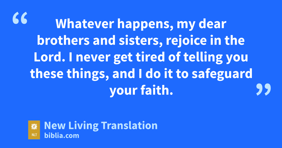 Whatever happens, my dear brothers and sisters,* rejoice in the Lord. I never get tired of telling you these things, and I do it to safeguard your faith.
