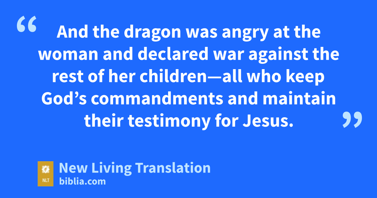 15 Then the dragon tried to drown the woman with a flood of water that flowed from his mouth. 16 But the earth helped her by opening its mouth and swallowing the river that gushed out from the mouth of the dragon. 17 And the dragon was angry at the woman and declared war against the rest of her children—all who keep God’s commandments and maintain their testimony for Jesus.