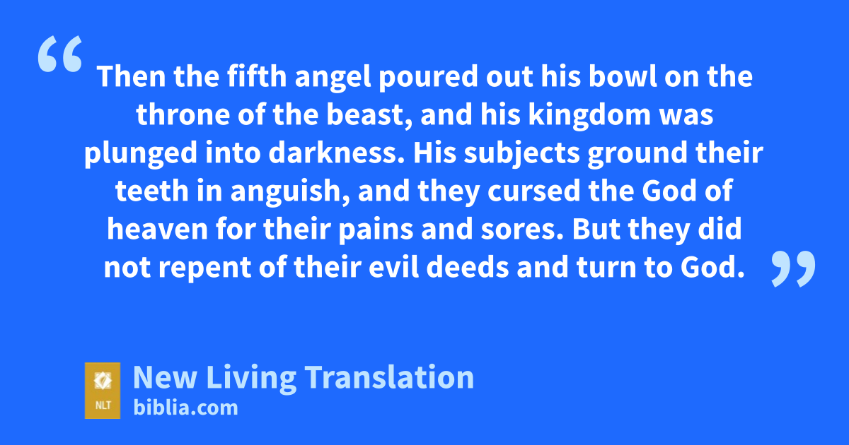 10 Then the fifth angel poured out his bowl on the throne of the beast, and his kingdom was plunged into darkness. His subjects ground their teeth* in anguish, 11 and they cursed the God of heaven for their pains and sores. But they did not repent of their evil deeds and turn to God.