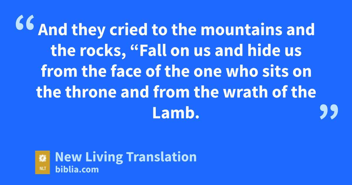 15 Then everyone—the kings of the earth, the rulers, the generals, the wealthy, the powerful, and every slave and free person—all hid themselves in the caves and among the rocks of the mountains. 16 And they cried to the mountains and the rocks, “Fall on us and hide us from the face of the one who sits on the throne and from the wrath of the Lamb. 17 For the great day of their wrath has come, and who is able to survive?”