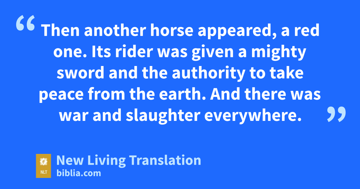 3 When the Lamb broke the second seal, I heard the second living being say, “Come!” 4 Then another horse appeared, a red one. Its rider was given a mighty sword and the authority to take peace from the earth. And there was war and slaughter everywhere.