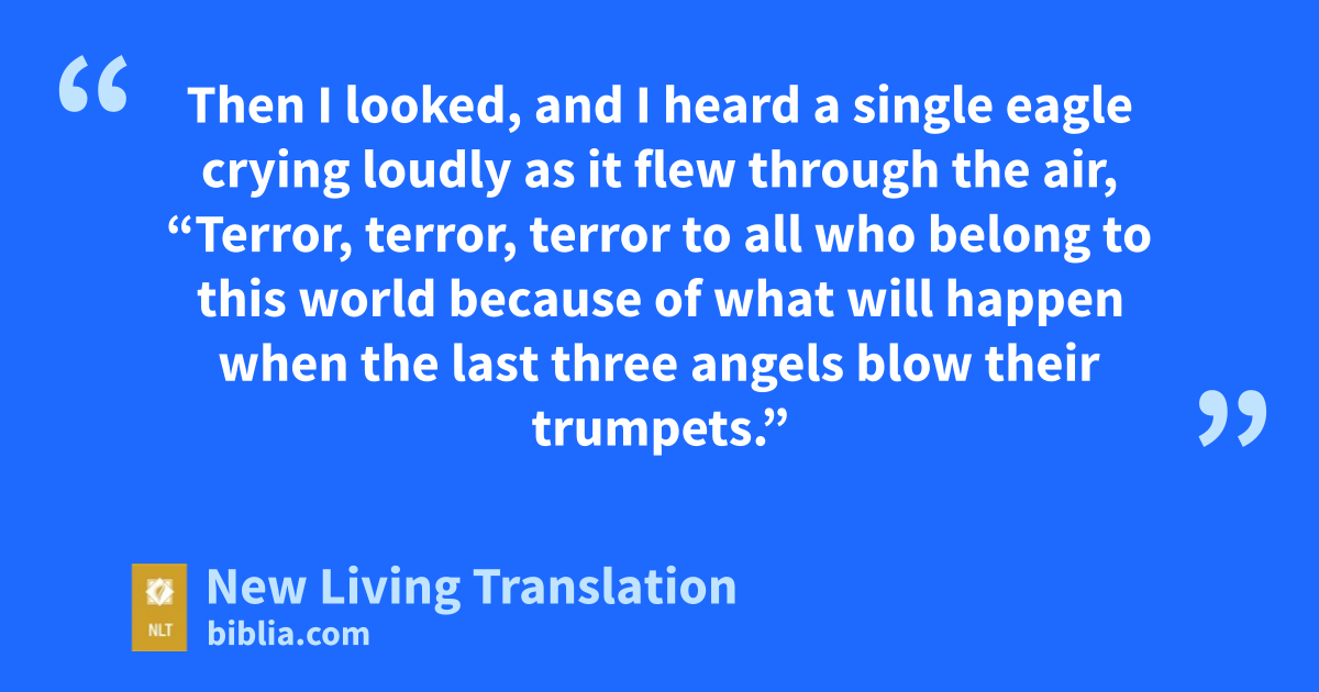 13 Then I looked, and I heard a single eagle crying loudly as it flew through the air, “Terror, terror, terror to all who belong to this world because of what will happen when the last three angels blow their trumpets.”